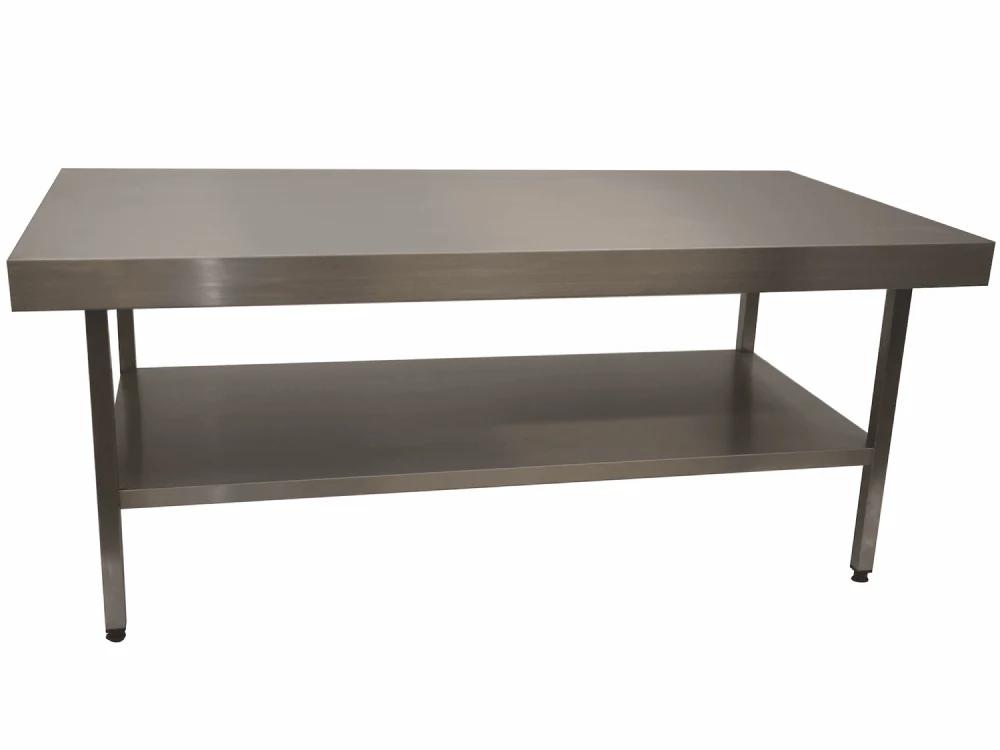 Stół pakujący i roboczy o solidnej konstrukcji, z całkowicie gładkim blatem, pełną dolną półką oraz regulowanymi nogami.