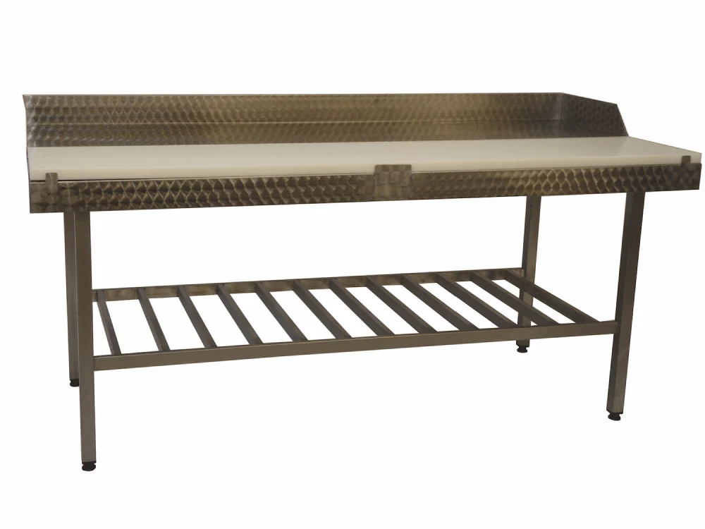 Прочный односторонний разделочный стол со столешницей из пластика ПЭ, гранулированной поверхностью, ребристой нижней полкой и регулируемыми ножками.